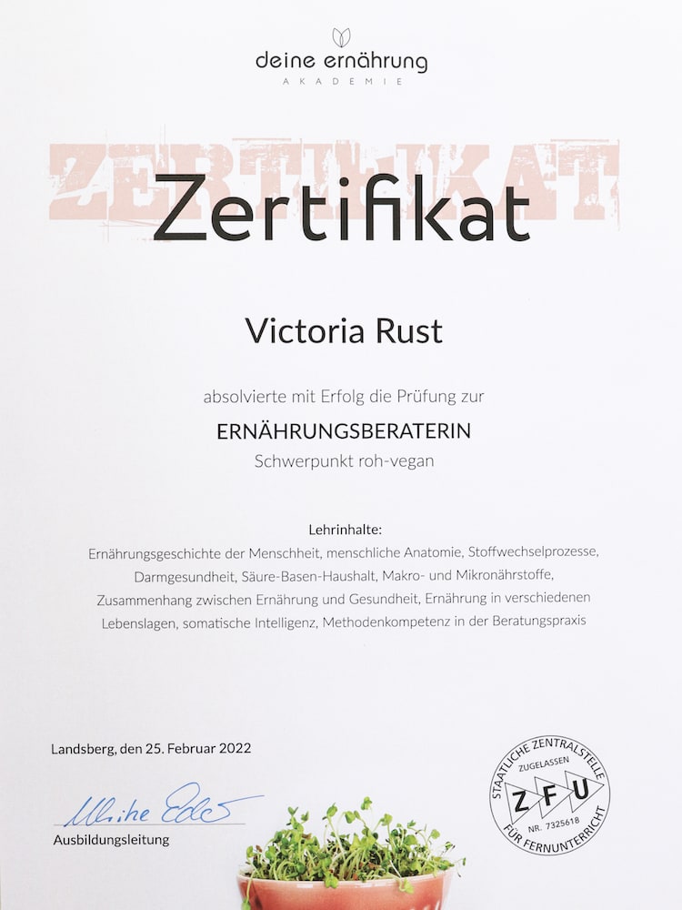 Ich als zertifizierter Health Coach und Ernährungsberaterin mit Fokus auf rohvegane Ernährung unterstütze Dich dabei, eine erfolgreiche Ernährungsumstellung und Deine persönlichen Gesundheitsziele zu setzen und zu erreichen. Bei meinem VIP Coaching lernst Du, wie Du langfristig einen gesunden Lebensstil führst und mehr frische Lebensmittel und Gerichte in Deinen Alltag integrieren kannst. Dieses Wissen wird Dich für den Rest Deines Lebens begleiten!